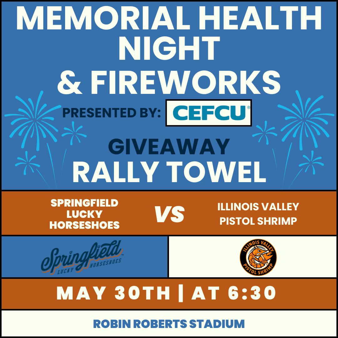 Get ready for a packed night of fun as the ‘Shoes take on the Illinois Valley Pistol Shrimp! It’s Memorial Health Night, be sure to arrive early to receive a Rally Towel to help cheer the team to victory. Stick around after the game for an incredible postgame fireworks show presented by CEFCU lighting up the Springfield sky!