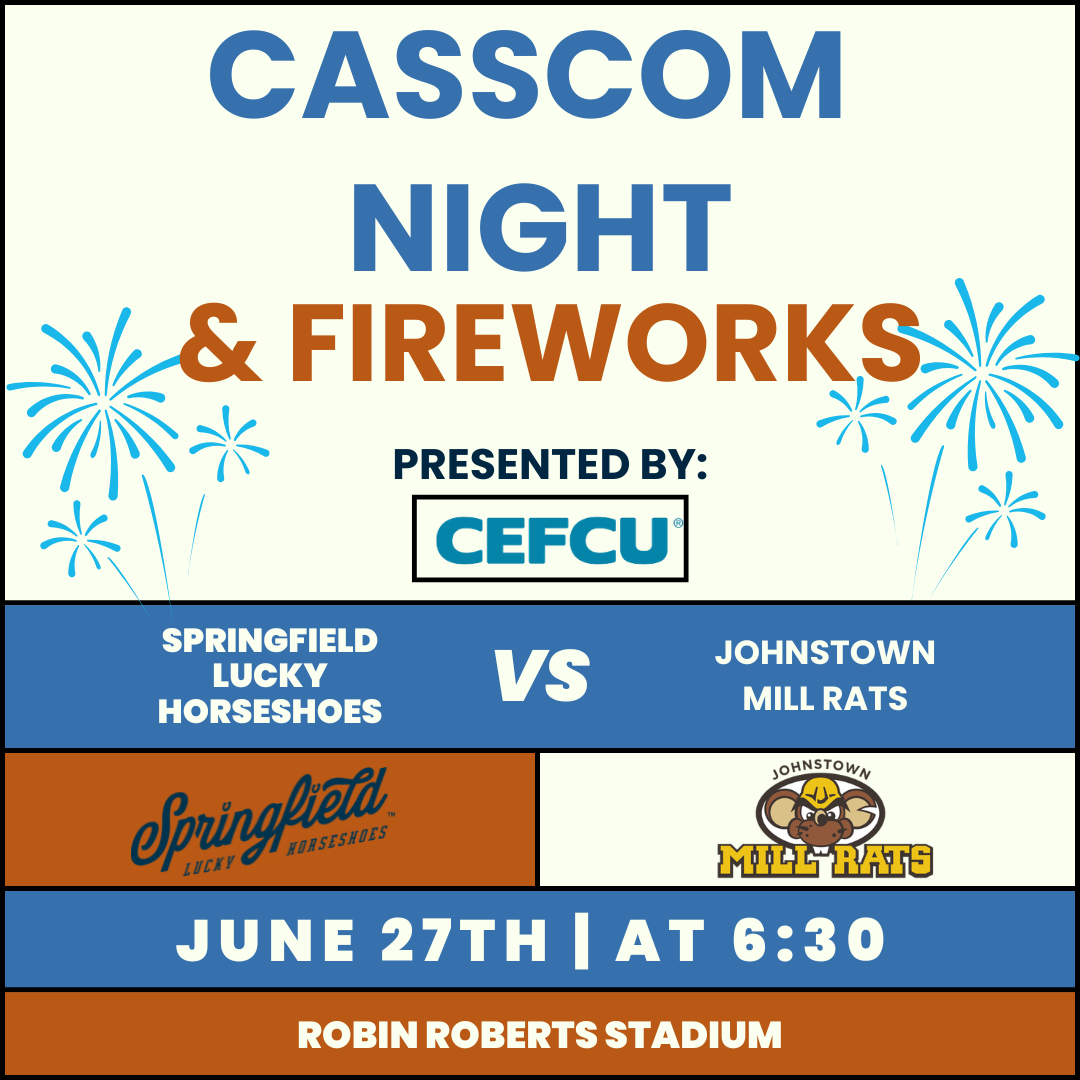 It’s CASSCOM Night at the ballpark as the ‘Shoes battle the Johnstown Mill Rats! Join the fun of Saving 2nd Base Night and stay after the game for a spectacular postgame fireworks show presented by CEFCU lighting up the sky over Robin Roberts Stadium.