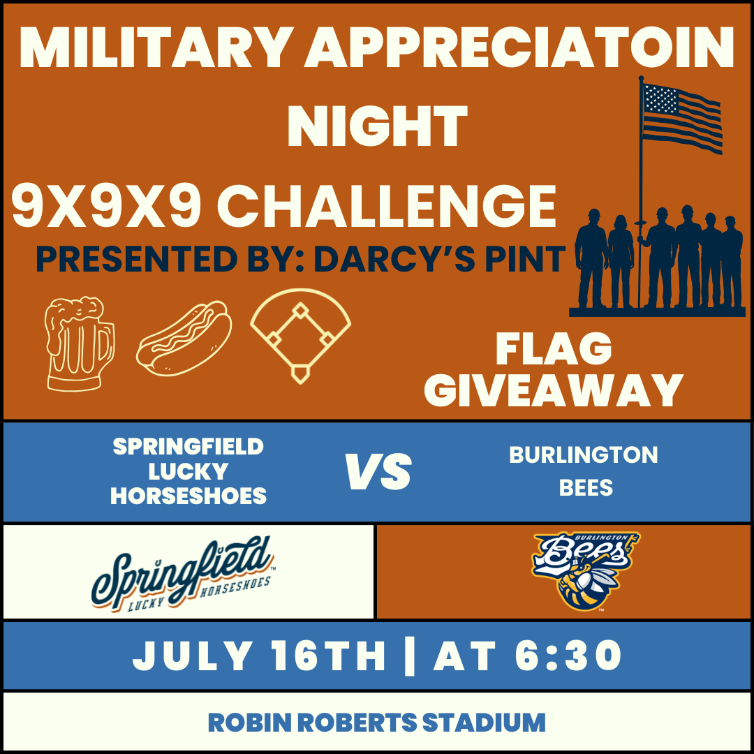 Get ready for a night of honoring our heroes and enjoying great food as the ’Shoes take on the Burlington Bees! It’s Military Appreciation Night with a flag giveaway, and fans can take on the 9x9x9 Challenge presented by Darcy’s Pint: $45 gets you 9 hot dogs, 9 beers, and a participant t-shirt. Don’t miss this fun and patriotic night at the ballpark!